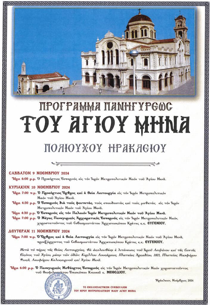 Αρχική ΚΡΗΤΗ Πρόγραμμα Ιεράς Πανηγύρεως Αγίου Μηνά Πολιούχου Ηρακλείου ΚΡΗΤΗ Πρόγραμμα Ιεράς Πανηγύρεως Αγίου Μηνά Πολιούχου Ηρακλείου 02/11/2024 FacebookTwitterPinterestWhatsApp ΣΤΗΝ ΙΔΙΑ ΚΑΤΗΓΟΡΙΑΔΙΑΒΑΣΤΕ ΕΠΙΣΗΣ Επίσκεψη του Παγκρήτιου Ομίλου Φουσκωτών Σκαφών στο Ηρώο Μνήμης και στο Μουσείο Ολοκαυτώματος Συνεχίζονται οι εντατικοί τροχονομικοί έλεγχοι από την Τροχαία του Βόρειου Οδικού Άξονα Κρήτης για την οδική ασφάλεια ΤΡΙΑ ΣΑΝΙΔΙΑ, ΔΥΟ ΠΡΟΣΩΠΑ, ΕΝΑ ΠΑΘΟΣ του Χρήστου Συρμακέζη ΔΙΑΒΑΣΤΕ ΕΠΙΣΗΣ Το Ισραήλ σχεδιάζει τουλάχιστον τρεις ακόμη εβδομάδες στρατιωτικής εκστρατείας εναντίον του... 16/03/2026 Επίσκεψη του Παγκρήτιου Ομίλου Φουσκωτών Σκαφών στο Ηρώο Μνήμης και στο... 16/03/2026 ΕΟΔΥ: Η ιλαρά συνεχίζει να προκαλεί σοβαρές επιπλοκές και θανάτους –... 16/03/2026 Συνεχίζονται οι εντατικοί τροχονομικοί έλεγχοι από την Τροχαία του Βόρειου Οδικού... 16/03/2026 Δολοφονία 20χρονου στην Καλαμαριά – Συμπληρωματική δίωξη στα δύο άτομα που... 16/03/2026