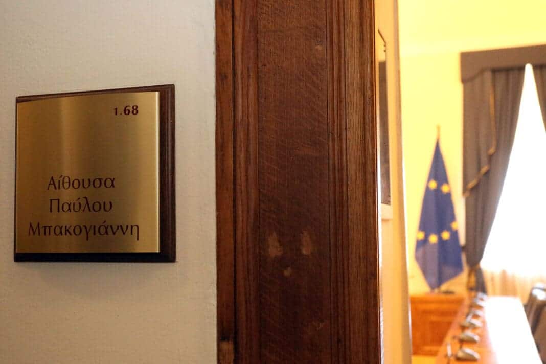 Μιλώντας στην τελετή ονοματοδοσίας, ο Πρόεδρος της Βουλής των Ελλήνων τόνισε πως «σήμερα, με τα αποκαλυπτήρια που κάνουμε και τη γενική απόφαση του Κοινοβουλίου να του αφιερώσουμε μία αίθουσα, αποδεικνύουμε ότι η θητεία του Παύλου Μπακογιάννη, που στέρησε το χέρι της τρομοκρατίας, δεν θέλουμε να διακοπεί.» Πρόσθεσε ότι «η Βουλή των Ελλήνων σήμερα, με την απόφασή της, συνεχίζει τη θητεία του Παύλου Μπακογιάννη στο εθνικό Κοινοβούλιο, σε πείσμα της τρομοκρατίας, σε πείσμα της δολοφονίας, σε πείσμα της λησμονιάς».