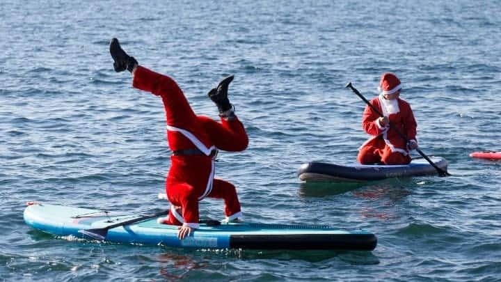 Σε μια δεύτερη δράση, άνδρες και γυναίκες φόρεσαν τις κόκκινες στολές και τους σκούφους του Άι Βασίλη και κωπηλάτησαν με τις σανίδες sup στον Θερμαϊκό Κόλπο, στο πλαίσιο του 4oυ SANTA SUP, που διοργάνωσε για τέταρτη συνεχή χρονιά η ομάδα ThesSup.gr που βρίσκεται στο Ναυτικό Όμιλο Θεσσαλονίκης, στην οδό Σοφούλη και διεξήχθη υπό την αιγίδα της Ομοσπονδίας Κανόε Καγιάκ. Αμέσως μετά τη «βόλτα» στη θάλασσα, υπήρχε στην παραλία ένας κουμπαράς για το «Χαμόγελο του Παιδιού» ώστε οι ενδιαφερόμενοι να προσφέρουν προαιρετικά ό,τι επιθυμούν.