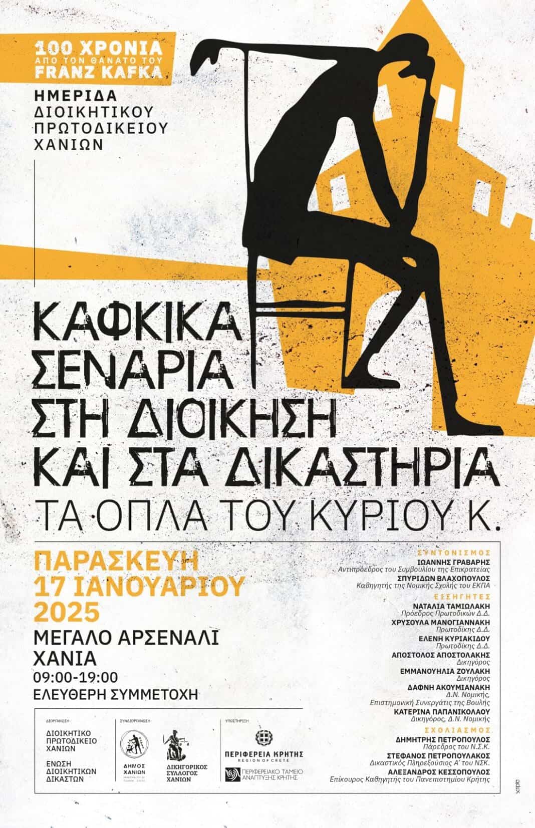 Με αφορμή τα εκατό χρόνια από τον θάνατο του Φραντς Κάφκα, το Διοικητικό Πρωτοδικείο Χανίων και η Ένωση Διοικητικών Δικαστών με τη στήριξη της Περιφέρειας Κρήτης διοργανώνουν την Παρασκευή 17 Ιανουαρίου στα Χανιά (Μεγάλο Αρσενάλι), ημερίδα, με τίτλο «Καφκικά Σενάρια στη Διοίκηση και στα Δικαστήρια. Τα όπλα του κυρίου Κ.». Στην ημερίδα θα προεδρεύσουν ο Αντιπρόεδρος του ΣτΕ Ιωάννης Γράβαρης και ο Καθηγητής της Νομικής του ΕΚΠΑ Σπυρίδων Βλαχόπουλος.