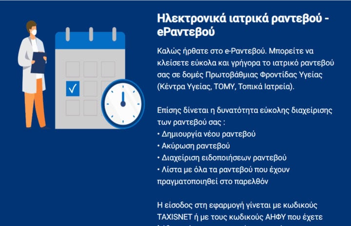 Μια νέα κεντρική πλατφόρμα για ηλεκτρονικά ραντεβού, το finddoctors.gov.gr, στην οποία συμμετέχουν όλες οι δημόσιες δομές Υγείας, 3.500 ιδιώτες γιατροί ειδικότητας συμβεβλημένοι με τον ΕΟΠΥΥ ανακοίνωσε χθες η πολιτική ηγεσία του υπουργείου Υγείας με στόχο την γρηγορότερη εξυπηρέτηση των πολιτών που αναζητούν γιατρό ειδικότητας κοντά στον τόπο κατοικίας τους.