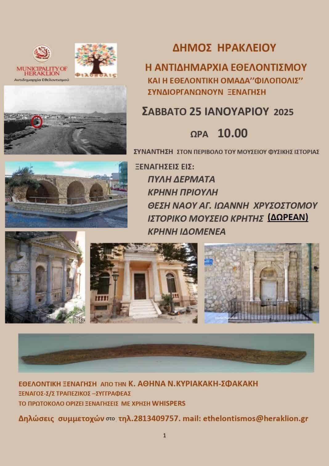 Νέα ξενάγηση στην πόλη του Ηρακλείου θα πραγματοποιηθεί το Σάββατο 25 Ιανουαρίου στο πλαίσιο στο πλαίσιο του δεύτερου κύκλου των δωρεάν ξεναγήσεων που εγκαινίασε ο Δήμος Ηρακλείου και η Αντιδημαρχία Εθελοντισμού σε συνεργασία με την Ομάδα «Φιλόπολις» και την εθελοντική προσφορά της ξεναγού Αθηνάς Κυριακάκη- Σφακάκη.