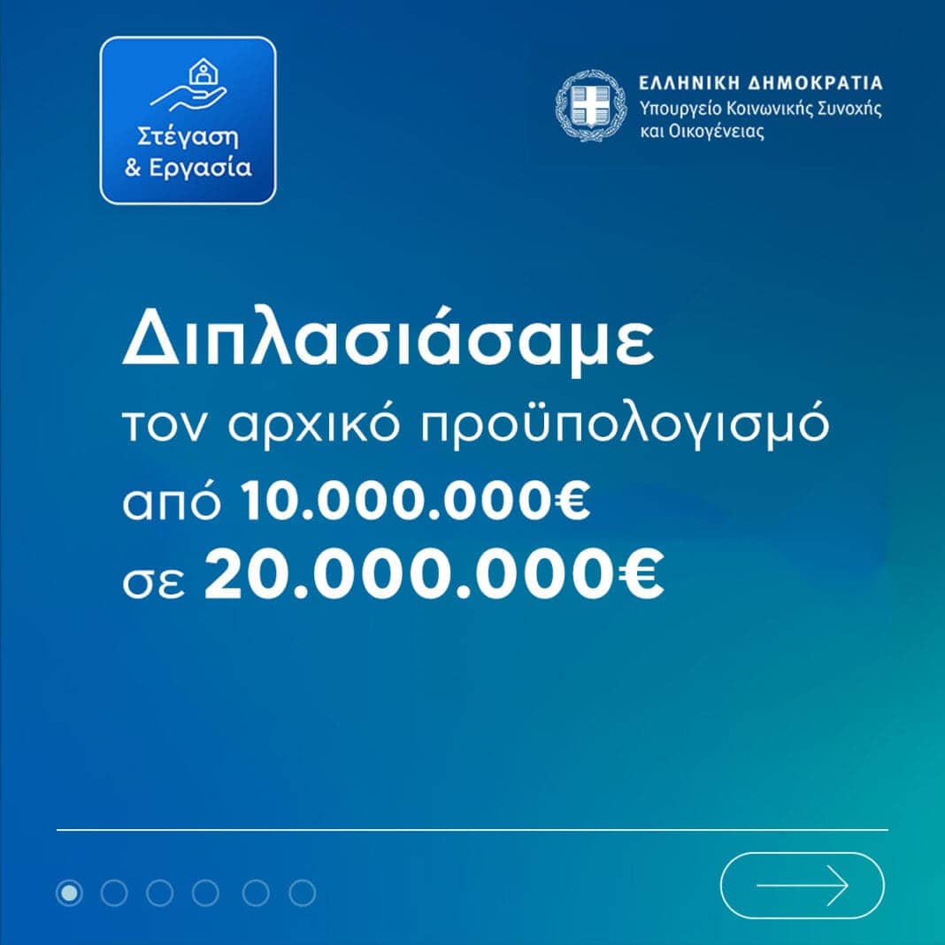 Αυξάνεται στα 20 εκατ. ευρώ από 10 εκατ. ευρώ, ο προϋπολογισμός του προγράμματος «Στέγαση και Εργασία για τους αστέγους» που υλοποιεί το Υπουργείο Κοινωνικής Συνοχής και Οικογένειας σε συνεργασία με τους Δήμους, προκειμένου να εξασφαλιστεί κοινωνική κατοικία σε πολλές κατηγορίες ευάλωτων οι οποίοι βρίσκονται σε αστεγία ή σε επισφάλεια στέγης.