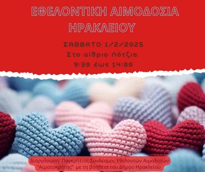 Το Σάββατο 1 Φεβρουαρίου 2025 θα πραγματοποιηθεί εθελοντική αιμοδοσία στο κέντρο της πόλης του Ηρακλείου και συγκεκριμένα στο αίθριο της Λότζια από τις 09:30 έως τις 14:00.