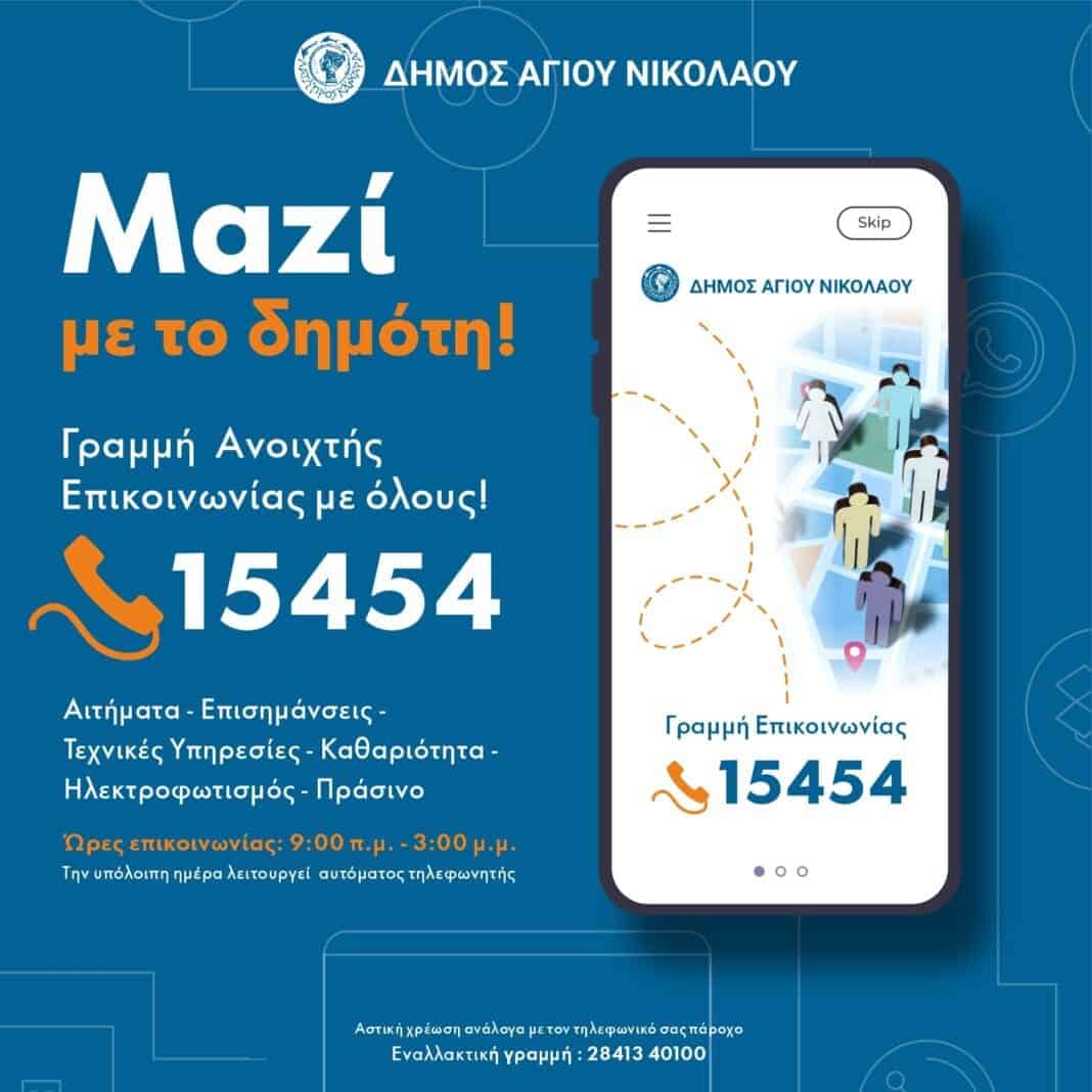 Ο Δήμος Αγίου Νικολάου εγκαινιάζει από τη Δευτέρα 3 Δεκεμβρίου 2025 τη λειτουργία μιας νέας τηλεφωνικής γραμμής το 15454 (αστική χρέωση, ανάλογα με τον τηλεφωνικό πάροχο) ή στο 28413-40100, που θα δίνει τη δυνατότητα σε όλους τους Δημότες να επικοινωνούν άμεσα με τον Δήμο.