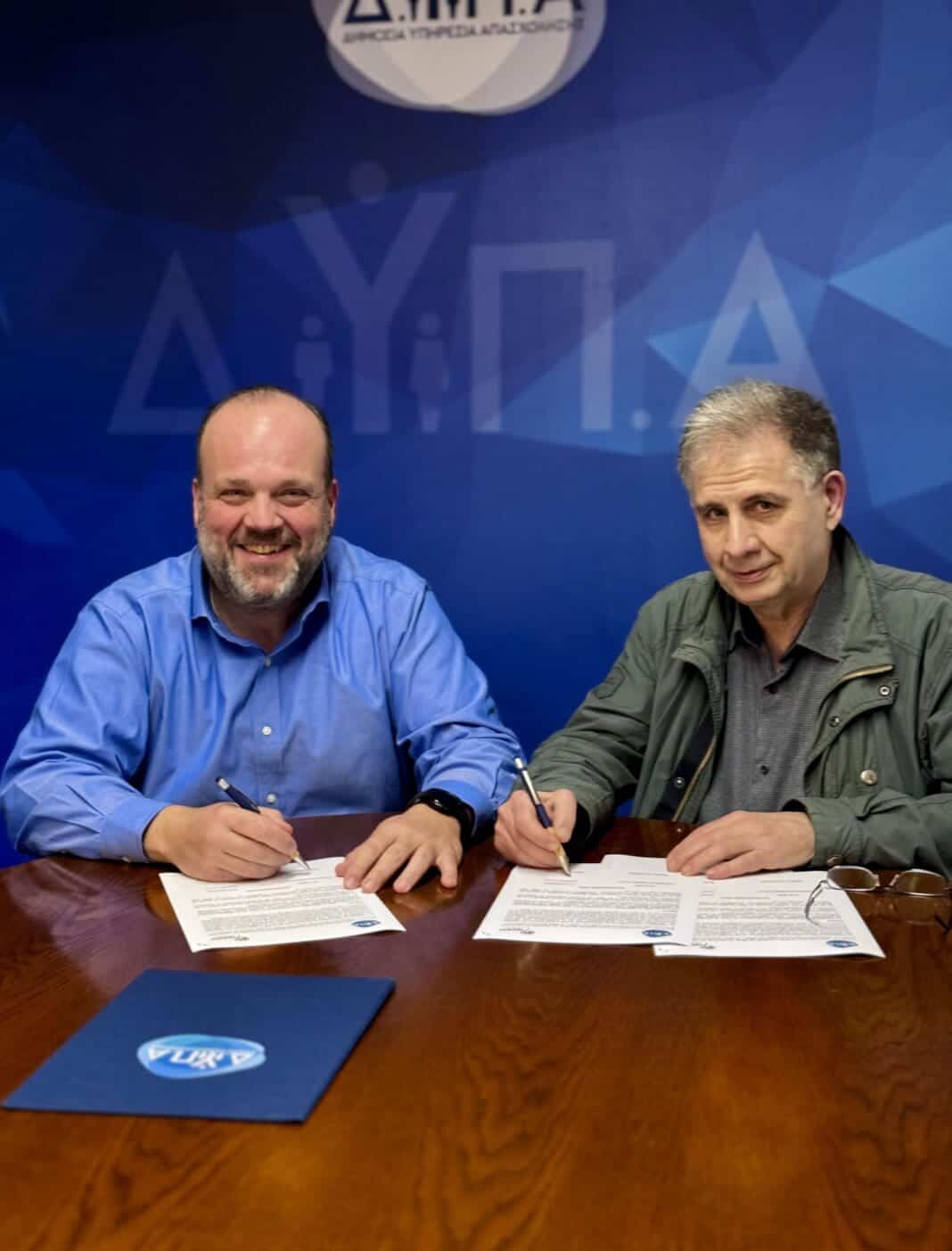 Μνημόνιο συνεργασίας υπέγραψαν χθες ο Διοικητής της Δημόσιας Υπηρεσίας Απασχόλησης (ΔΥΠΑ), Σπύρος Πρωτοψάλτης και ο Πρόεδρος του Διοικητικού Συμβουλίου του Εργαστηρίου Ειδικής Αγωγής «ΜΑΡΓΑΡΙΤΑ» (ΕΕΑ «ΜΑΡΓΑΡΙΤΑ»), Βασίλης Τσοκόπουλος.