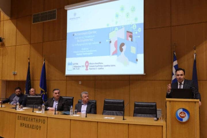 «Η ψηφιακή μετάβαση για την Περιφέρεια Κρήτης έχει επίκεντρο τον πολίτη», τόνισε ο Περιφερειάρχης Κρήτης Σταύρος Αρναουτάκης στην εκδήλωση που οργάνωσε η Περιφέρεια Κρήτης, με κεντρικό ομιλητή τον Υπουργό Ψηφιακής Διακυβέρνησης Δημήτρη Παπαστεργίου στο Επιμελητήριο Ηρακλείου.