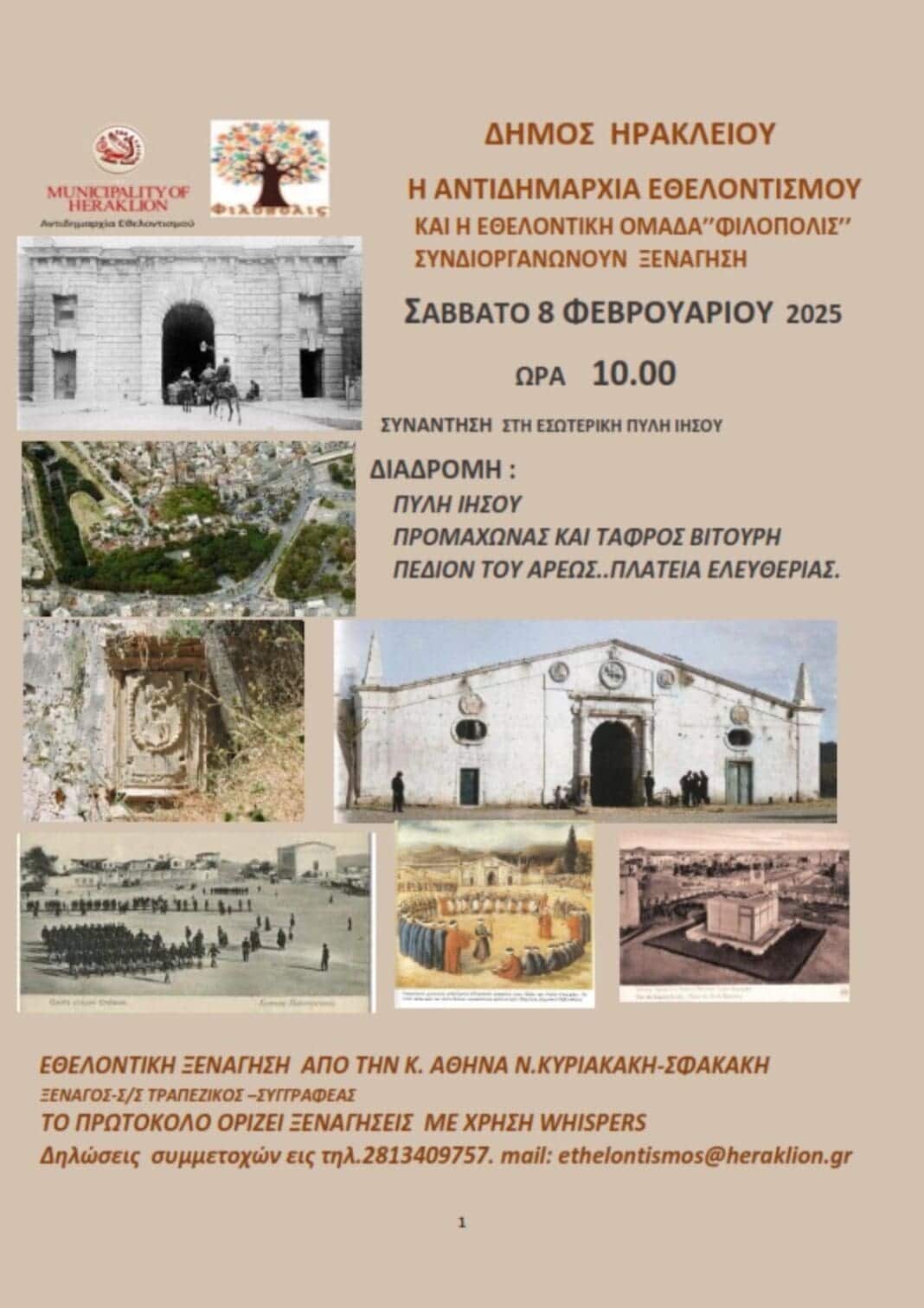 Στην καρδιά της πόλης θα πραγματοποιηθεί το Σάββατο 8 Φεβρουαρίου η επόμενη ξενάγηση στο πλαίσιο του δεύτερου κύκλου των δωρεάν ξεναγήσεων που εγκαινίασε ο Δήμος Ηρακλείου και η Αντιδημαρχία Εθελοντισμού σε συνεργασία με την Ομάδα «Φιλόπολις» και την εθελοντική προσφορά της ξεναγού Αθηνάς Κυριακάκη- Σφακάκη.