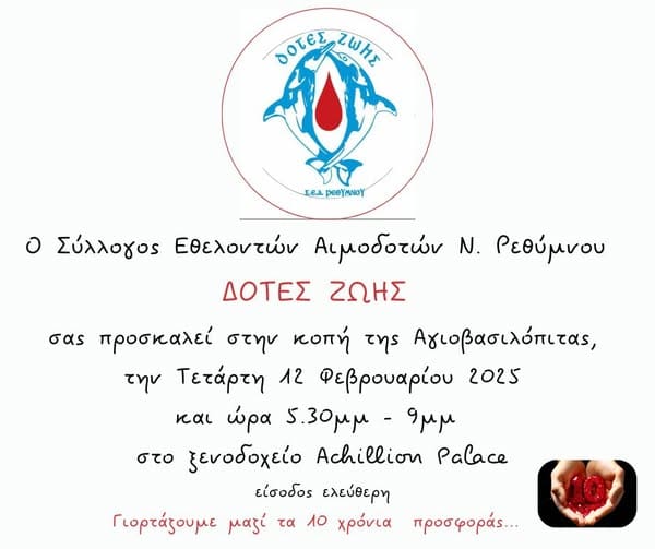 Δέκα χρόνια τώρα, με την αγάπη και τη στήριξή σας, χαρίζουμε ζωή μέσα από την εθελοντική αιμοδοσία και τη δωρεά μυελού των οστών. Ελάτε να γιορτάσουμε αυτή τη διαδρομή μαζί, να μοιραστούμε όμορφες στιγμές και να ανταλλάξουμε ευχές για τη νέα χρονιά!
