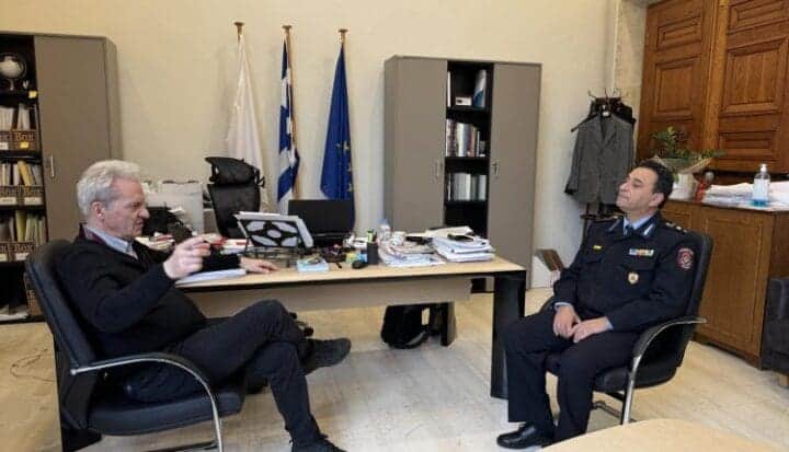 Σε πολύ καλό κλίμα πραγματοποιήθηκε η εθιμοτυπική συνάντηση του Δημάρχου Ηρακλείου Αλέξη Καλοκαιρινού με τον νέο Συντονιστή Πυροσβεστικών Επιχειρήσεων Βορείου, Νοτίου Αιγαίου και Κρήτης Υποστράτηγο Κωνσταντίνο Ψαρρό.
