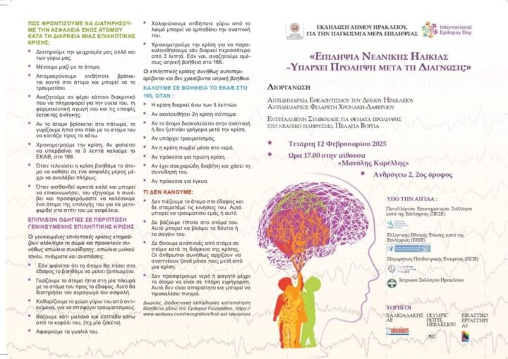 Στην εκδήλωση η οποία διοργανώνεται από την Αντιδημαρχία Εθελοντισμού του Δήμου Ηρακλείου και από την Εντεταλμένη Σύμβουλο για θέματα Πρόληψης στο Νεανικό Πληθυσμό Παιδίατρο, Παιδονευρολόγο, Επιληπτολόγο MD, MSc, PhD Πελαγία Βοργιά, διακεκριμένοι επιστήμονες θα μιλήσουν για την επιληψία, μια από τις πιο συχνές νευρολογικές διαταραχές της παιδικής και εφηβικής ηλικίας, με στόχο την ενημέρωση του κοινού σχετικά με την διαχείριση της νόσου μετά τη διάγνωση και τις προκλήσεις που αντιμετωπίζουν τα άτομα επιληψία και οι οικογένειες τους.
