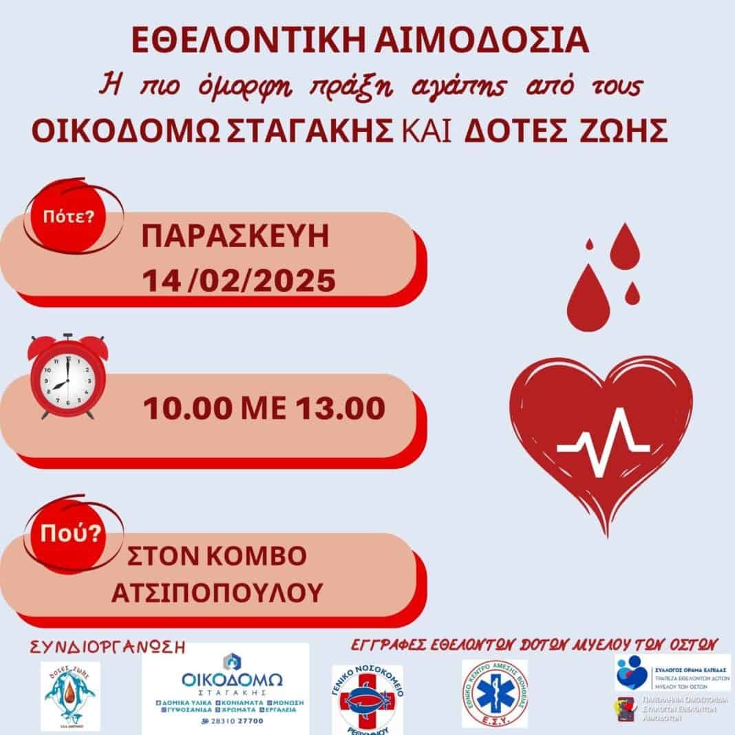 Η διοίκηση και το προσωπικό της εταιρίας “ΟΙΚΟΔΟΜΩ ΣΤΑΓΑΚΗΣ” σε συνεργασία με τον Σύλλογο Εθελοντών Αιμοδοτών Ν. Ρεθύμνου ΔΟΤΕΣ ΖΩΗΣ, σας προσκαλεί να συμμετέχετε σε μία όμορφη πράξη αγάπης προσφέροντας εθελοντικά αίμα,