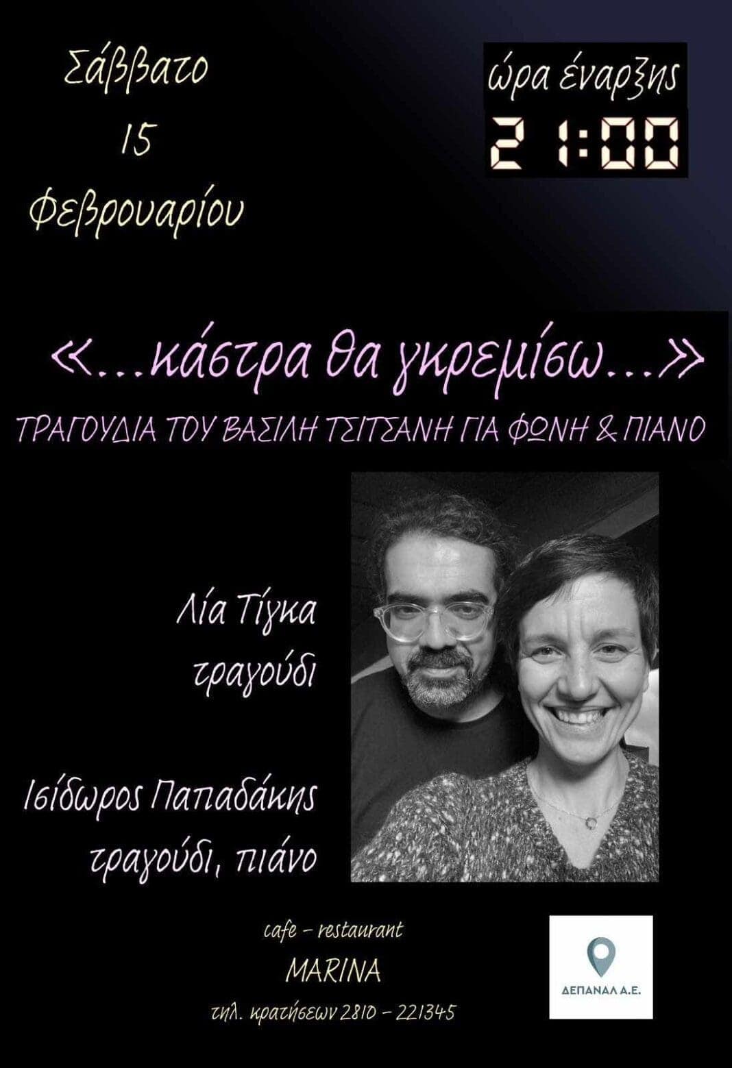 Το Σάββατο 15 Φεβρουαρίου, στις 21:00 διοργανώνεται μία μουσική βραδιά με τραγούδια του Βασίλη Τσιτσάνη για φωνή και πιάνο με τίτλο «…κάστρα θα γκρεμίσω…».