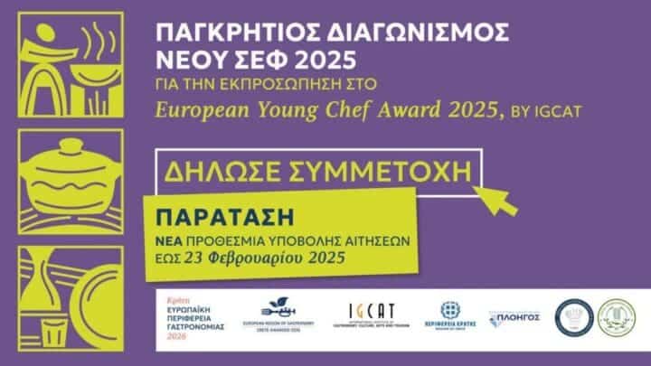 Στο πλαίσιο της πρωτοβουλίας “Κρήτη Ευρωπαϊκή Περιφέρεια Γαστρονομίας 2026”, η Περιφέρεια Κρήτης απευθύνει ανοικτή πρόσκληση σε σπουδαστές μαγειρικής ή πρόσφατα αποφοιτήσαντες σεφ που δραστηριοποιούνται στην Κρήτη για να λάβουν μέρος στον Παγκρήτιο Διαγωνισμό Νέου Σεφ 2025.