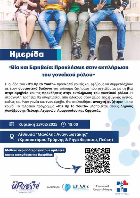 Ημερίδα με τίτλο «Βία και Εφηβεία: Προκλήσεις στην εκπλήρωση του γονεϊκού ρόλου» πραγματοποιείται την Κυριακή 23 Φεβρουαρίου στις 18.00 στην Αίθουσα “Μανόλης Αναγνωστάκης” στο Δημοτικό Θέατρο Πεύκης, (Χρυσοστόμου Σμύρνης & Ρήγα Φεραίου, Πεύκη).