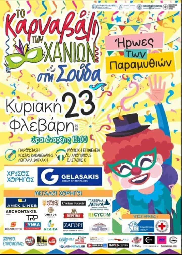 Υπενθυμίζεται ότι το Χανιώτικο Καρναβάλι, που διοργανώνεται από τον Δήμο Χανίων, την Περιφέρεια Κρήτης, την Περιφερειακή Ενότητα Χανίων, σε συνεργασία με την Ένωση Επιχειρηματιών Σούδας και τον Πολιτιστικό Σύλλογο της περιοχής, φέτος έχει ως θέμα τους ήρωες των παραμυθιών.