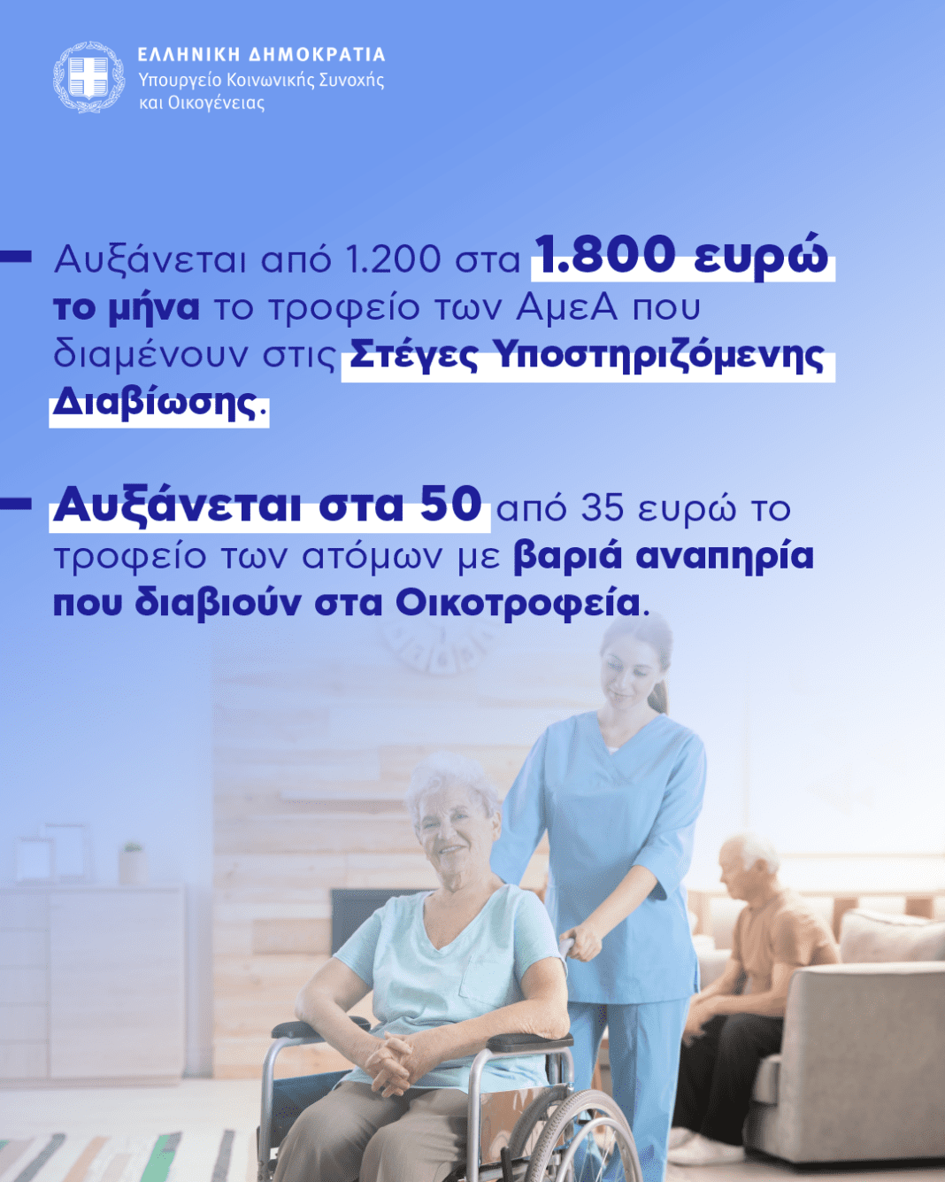 Αυξάνεται κατά 50% το ημερήσιο τροφείο (αποζημίωση), για τα Άτομα με Αναπηρία που διαμένουν σε Στέγες Υποστηριζόμενης Διαβίωσης και κατά 44% το ημερήσιο τροφείο για τα άτομα με βαριά αναπηρία που διαμένουν σε Οικοτροφεία, με κοινή απόφαση της Υπουργού Κοινωνικής Συνοχής και Οικογένειας, Σοφίας Ζαχαράκη, του Υπουργού Υγείας, Άδωνι Γεωργιάδη και του Υφυπουργού Εθνικής Οικονομίας και Οικονομικών Θάνου Πετραλιά.