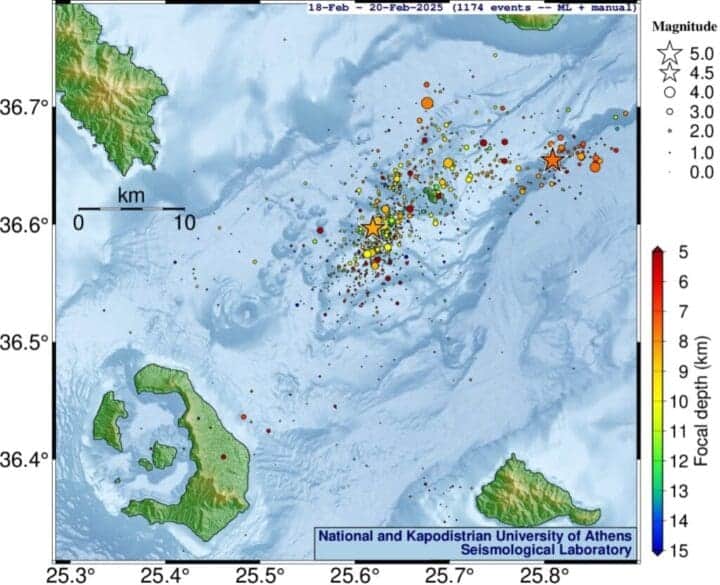 Από την έναρξη της σεισμικής δραστηριότητας στη ζώνη Σαντορίνης-Αμοργού στις 26 Ιανουαρίου έως και τις 19 Φεβρουαρίου 2025, το Εργαστήριο Σεισμολογίας (ΕΣ) του ΕΚΠΑ (http://dggsl.geol.uoa.gr/) έχει ανιχνεύσει και εντοπίσει συνολικά, με αυστηρά κριτήρια για τη διασφάλιση της ποιότητας των αποτελεσμάτων, πάνω από 22,600 σεισμούς με μεθόδους μηχανικής μάθησης (τεχνητής νοημοσύνης), εκ των οποίων άνω των 19,300 με μεγέθη Μ³1.0. Στις 18 Φεβρουαρίου καταγράφηκαν πάνω από 600 σεισμοί, με 37 να έχουν μέγεθος Μ³2.5, τρεις (3) σεισμούς με Μ³4.0, και δύο (2) με Μ³4.5, με τους δύο ισχυρότερους σεισμούς, μεγέθους 4.9, να σημειώνονται στις 06:46:53 και 08:08:09 (τοπική ώρα). Στις 19 Φεβρουαρίου καταγράφηκαν πάνω από 450 σεισμοί, με 27 να έχουν μέγεθος Μ³2.5, έναν (1) σεισμό με Μ³4.0, και κανέναν (0) με Μ³4.5, με τον ισχυρότερο σεισμό μεγέθους 4.2 να καταγράφεται στις 11:41:09 (τοπική ώρα) βόρεια της Ανύδρου. Σύμφωνα με τα στοιχεία καθημερινής ανάλυσης σεισμικών δεδομένων (χωρίς χρήση μεθόδων μηχανικής μάθησης) του Εργαστηρίου Σεισμολογίας του ΕΚΠΑ, κατά την 20η Φεβρουαρίου έχουν καταγραφεί 57 σεισμοί, εκ των οποίων κανένας (0) με μέγεθος M³4.0. O ισχυρότερος σεισμός, μεγέθους 3.7, σημειώθηκε στις 00:09:53 της 21ης Φεβρουαρίου (τοπική ώρα). Η σεισμικότητα παρουσιάζει σταδιακή ύφεση, τόσο ως προς τον ημερήσιο αριθμό σεισμών όσο και ως προς το μέγιστο μέγεθος, χωρίς να έχει παρατηρηθεί κάποια νέα μικροσεισμική έξαρση από τις 15 Φεβρουαρίου.