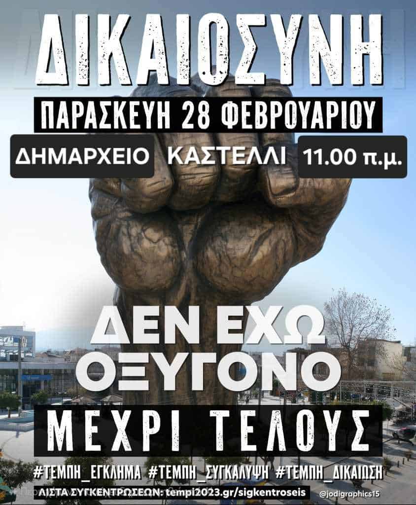 Επίσης, οι Σύλλογοι Γονέων και Κηδεμόνων των Σχολείων του Καστελλίου, ο Πολιτιστικός και Εμπορικός Σύλλογος Καστελλίου, η ομάδα Δωριέας και το 7ο Σύστημα Αεροπροσκόπων Καστελλίου, στηρίζουν τις κινητοποιήσεις και τον αγώνα για δικαίωση των θυμάτων των Τεμπών και συμμετέχουν στη διαμαρτυρία που θα γίνει στις 11 το πρωί, στο Δημοτικό Κατάστημα Καστελλίου.