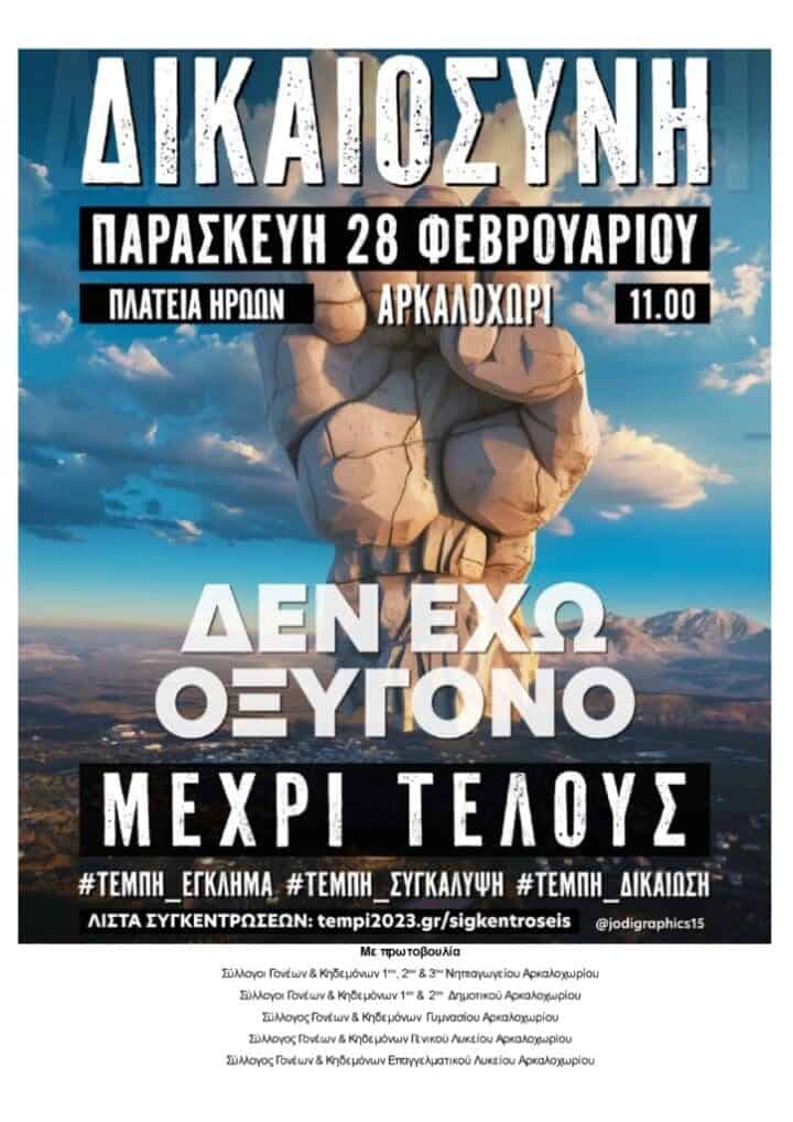 Με αφορμή τη συμπλήρωση δύο χρόνων από το τραγικό δυστύχημα των Τεμπών μαθητές και φορείς του Δήμου Μινώα Πεδιάδας, θα στείλουν το δικό τους μήνυμα και θα απαιτήσουν να αποδοθεί Δικαιοσύνη και να μην συγκαλυφθεί η αδιανόητη αυτή τραγωδία που στοίχησε τη ζωή σε 57 ψυχές.  Στο Αρκαλοχώρι η κινητοποίηση ορίζεται στις 11 το πρωί της Παρασκευής 28 Φεβρουαρίου, με σημείο εκκίνησης την Πλατεία Ηρώων. Πρόκειται για πρωτοβουλία του Συλλόγου Γονέων & Κηδεμόνων των σχολείων Α/θμιας και Β/θμιας Εκπ/σης του Αρκαλοχωρίου.