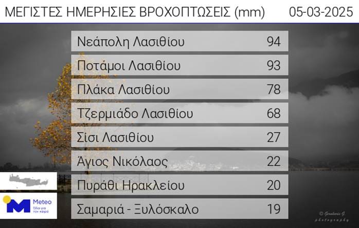 Σημαντικές βροχοπτώσεις σημειώθηκαν κυρίως στην Ανατολική Κρήτη την Τετάρτη 05/03.