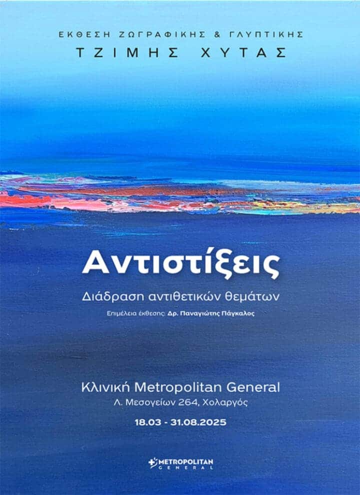To έργο του Ξενάκη υποδέχεται τα έργα του σύγχρονου εικαστικού Τζίμη Χύτα, στην έκθεση ζωγραφικής – γλυπτικής με τίτλο «Αντιστίξεις». Τα έργα του κ. Χύτα, δείγματα ότι η Τέχνη και η Υγεία είναι συνοδοιπόροι στην προσέγγιση του  εὖ ζῆν, θα κοσμούν χώρους του Metropolitan General στη Λεωφόρο Μεσογείων 264, από τις 18 Μαρτίου έως τις 31 Αυγούστου 2025, προσφέροντας χρώμα, έμπνευση και μια ιδιαίτερη εμπειρία σε εξεταζόμενους, ασθενείς και επισκέπτες.