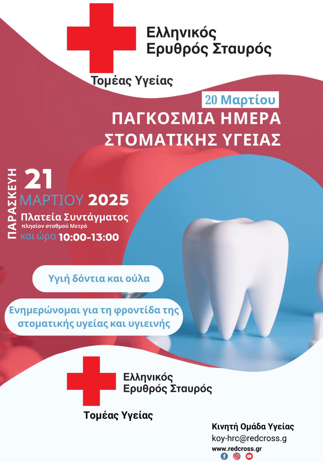 Ο Ελληνικός Ερυθρός Σταυρός (ΕΕΣ), με αφορμή την Παγκόσμια Ημέρα Στοματικής Υγείας, διοργανώνει δράση ενημέρωσης για τη φροντίδα της στοματικής υγείας και υγιεινής, την Παρασκευή 21 Μαρτίου 2025 και ώρα 10.00-13.00, στην Πλατεία Συντάγματος (πλησίον του Σταθμού Μετρό).