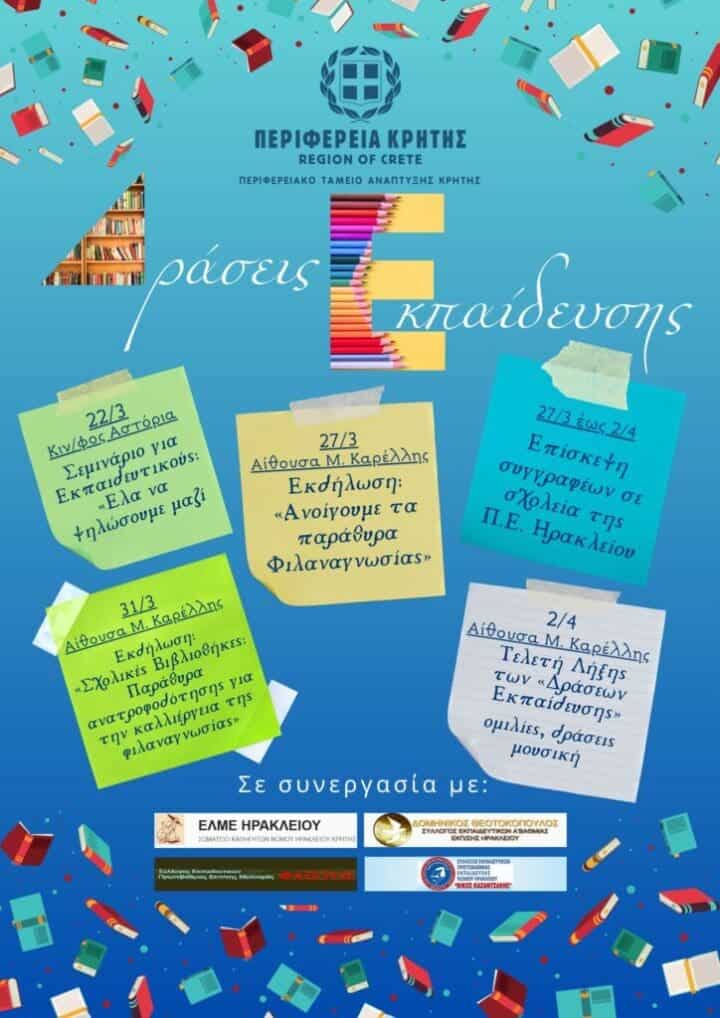 Η Περιφέρεια Κρήτης, σε συνεργασία με τους Συλλόγους Εκπαιδευτικών Πρωτοβάθμιας Εκπαίδευσης Ηρακλείου («Δομήνικος Θεοτοκόπουλος», «Νίκος Καζαντζάκης», «Φαιστός») και την ΕΛΜΕ Ηρακλείου, διοργανώνει τις «Δράσεις Εκπαίδευσης», έναν κύκλο εκδηλώσεων αφιερωμένο στη φιλαναγνωσία, την επαγγελματική ανάπτυξη των εκπαιδευτικών και την καλλιέργεια πολιτιστικών δεξιοτήτων στους μαθητές.