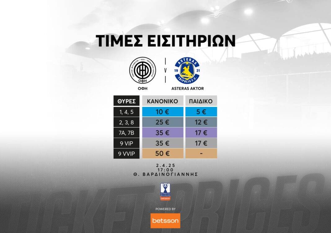 Αναλυτικά οι τιμές των απλών εισιτηρίων για τον αγώνα με τον Asteras AKTOR (2/4):
