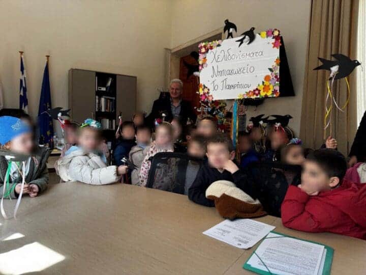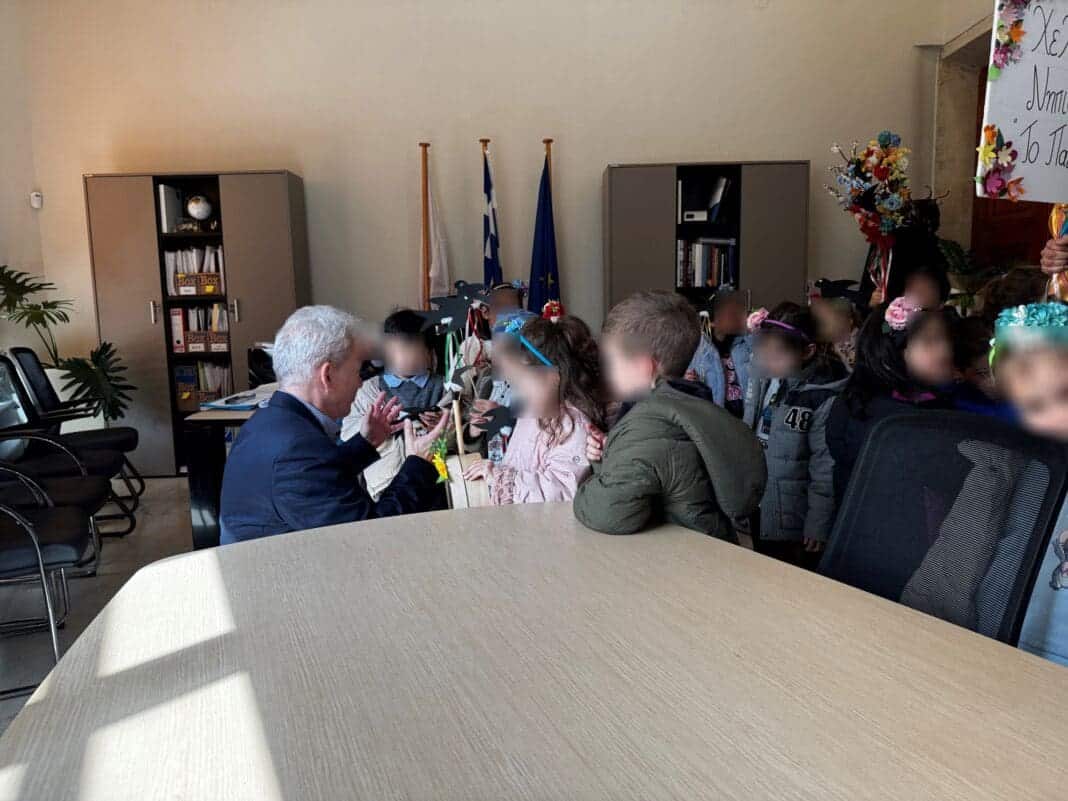 Ο Δήμαρχος Ηρακλείου Αλέξης Καλοκαιρινός υποδέχθηκε με χαρά στο γραφείο του τα μικρά παιδιά των δύο σχολείων που τραγούδησαν με κέφι τα χελιδονίσματα, τα παραδοσιακά κάλαντα της Άνοιξης.