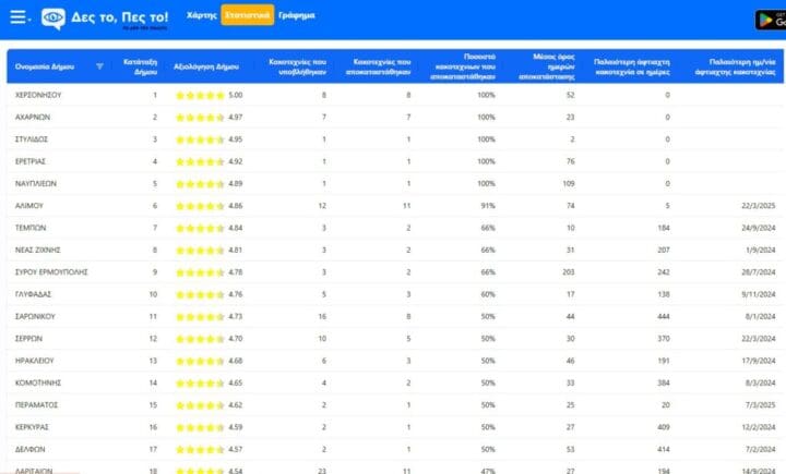«Η πλατφόρμα «Δες το Πες το» καθημερινά αξιολογεί και βαθμολογεί τους Δήμους της Ελλάδας με ένα αλγόριθμο τεχνητής νοημοσύνης ανάλογα με την ανταπόκριση τους στις αναφορές των κακοτεχνιών που κάνουν οι πολίτες ανώνυμα. Αυτή η αξιολόγηση και η βαθμολόγηση είναι η μοναδική αντικειμενική αφού στηρίζεται μόνο σε πραγματικά στοιχεία όπως οι κακοτεχνίες, ο μέσος χρόνος αποκατάστασης αυτών, οι εκκρεμότητες και άλλα.
