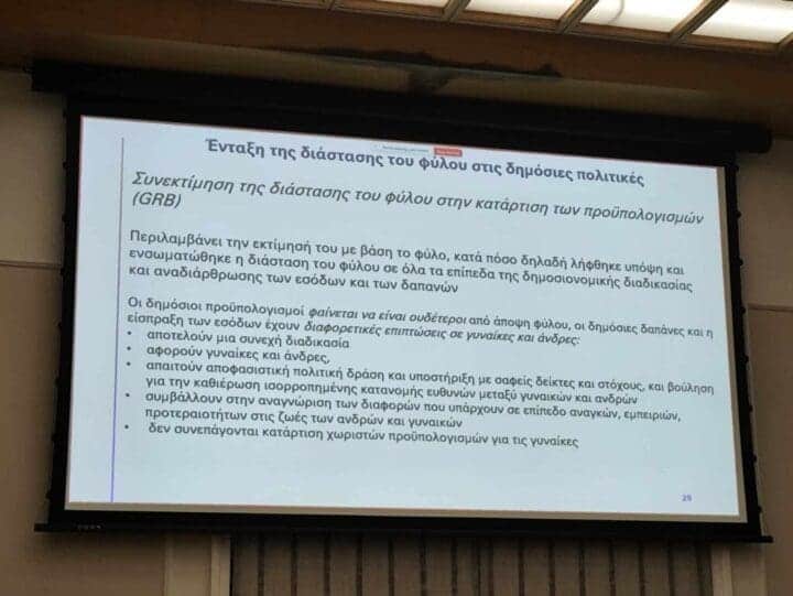 Το πρόγραμμα άρχισε με την εισήγηση της Δρ. Βάλιας Καλαϊτζή, η οποία είναι Σύμβουλος σε θέματα έμφυλης ισότητας, συμπερίληψης, ετερογένειας και διαφορετικότητας και εθνική εμπειρογνώμονας του Έργου «Gender Flagship-Gender mainstreaming in public policy and budgeting» στο οποίο συμμετέχει και η Περιφέρεια Κρήτης. Την εισήγηση προλόγισε η Μερόπη Απελίδου, πρώην προϊσταμένη του Αυτοτελούς Γραφείου Ισότητας.