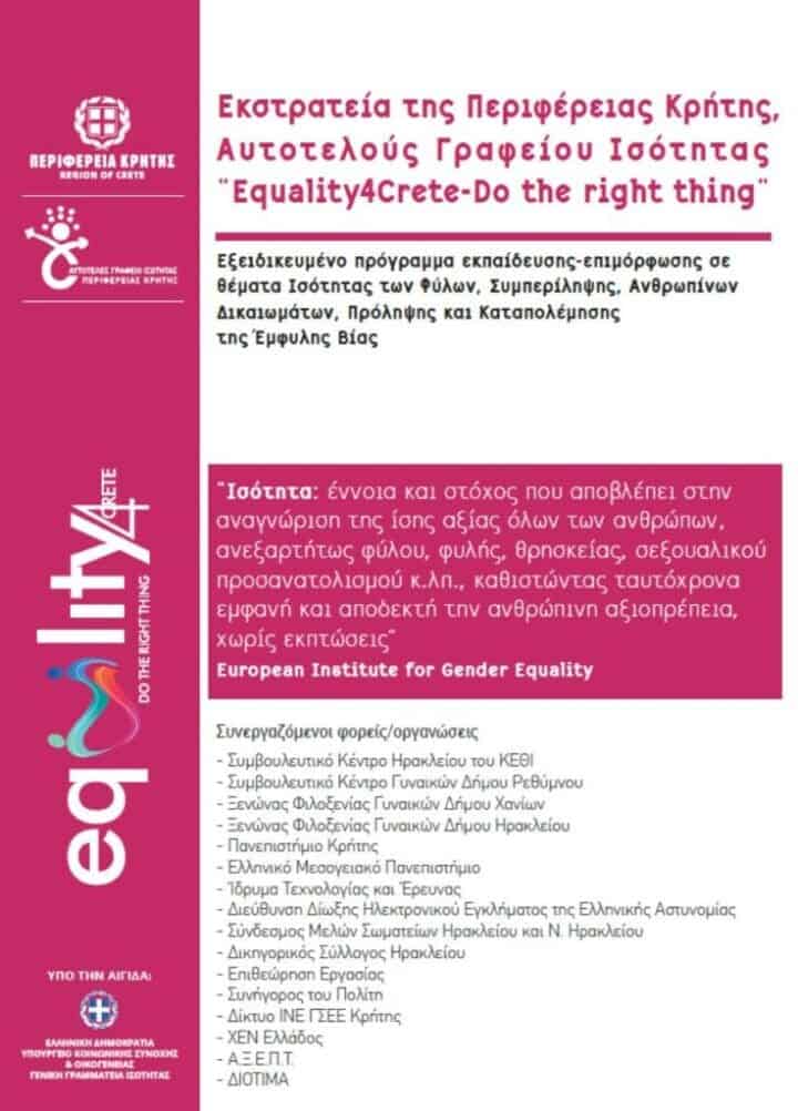 Το πρόγραμμα θα συνεχιστεί για όλο το χρόνο σε συνεργασία με ένα ευρύ φάσμα φορέων σε τοπικό, περιφερειακό και εθνικό επίπεδο και στοχεύει στην ενημέρωση, εκπαίδευση και ευαισθητοποίηση στα ζητήματα της έμφυλης ισότητας, της συμπερίληψης, των ανθρωπίνων δικαιωμάτων και της πρόληψης όλων των μορφών της έμφυλης βίας και εντάσσεται στην Εκστρατεία της Περιφέρειας Κρήτης, Αυτοτελούς Γραφείου Ισότητας «Equality4Crete-Do the right thing».