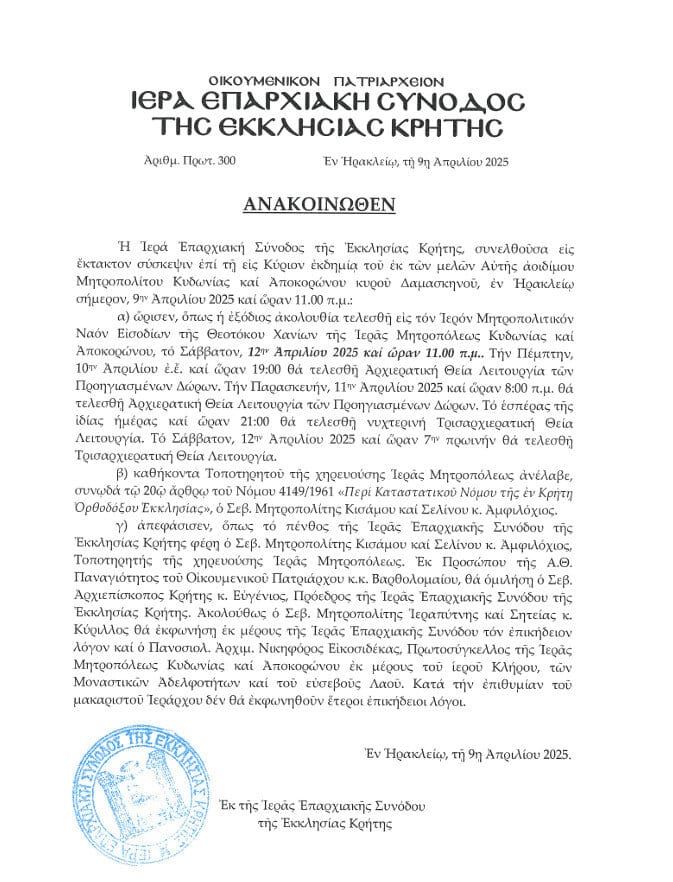 Αρχική ΚΡΗΤΗ Ανακοινωθέν της Ιεράς Επαρχιακής Συνόδου της Εκκλησίας Κρήτης για την εκδημία του... ΚΡΗΤΗ Ανακοινωθέν της Ιεράς Επαρχιακής Συνόδου της Εκκλησίας Κρήτης για την εκδημία του Μητροπολίτου Κυδωνίας και Αποκορώνου κυρού Δαμασκηνού 11/04/2025 FacebookTwitterPinterestWhatsApp ΣΤΗΝ ΙΔΙΑ ΚΑΤΗΓΟΡΙΑΔΙΑΒΑΣΤΕ ΕΠΙΣΗΣ Διευκρινίσεις για τον ΕΝΦΙΑ σεισμόπληκτων ακινήτων στο Δήμο Μινώα Πεδιάδας «Ο λαϊκός πολιτισμός της Κρήτης (Μουσική – Ποίηση – Χορός)» – Στην Λέσχη Ανάγνωσης «Καφές και Βιβλία» Ηράκλειο: Νέα άφιξη προσφύγων και μεταναστών ΔΙΑΒΑΣΤΕ ΕΠΙΣΗΣ Διήμερο κινητοποιήσεων στην υγεία 18/03/2026 Παγκόσμιο επισιτιστικό πρόγραμμα: Ο πόλεμος στο Ιράν πιθανόν να οδηγήσει 45... 18/03/2026 PwC: Ρεκόρ Εξαγορών και Συγχωνεύσεων στην Ελλάδα το 2025 18/03/2026 ΥΠΕΣ: 50 εκατ. ευρώ στους δήμους για δράσεις πυροπροστασίας 18/03/2026 Αύξηση του επιδόματος ανεργίας των ναυτικών – Β. Κικίλιας: Στηρίζουμε τους... 18/03/2026