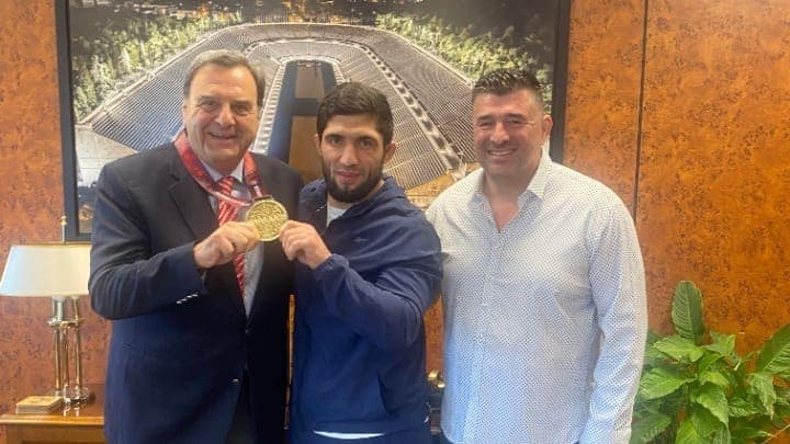 Στη συνάντηση ήταν μαζί και ο Ολυμπιονίκης και εκπρόσωπος της πάλης στην Ελληνική Ολυμπιακή Επιτροπή, Κώστας Θάνος, ενώ ο Νταουρέν Κουρουγκλίεβ για να ευχαριστήσει τον κ. Κούβελο για την πρόσκληση στην ΕΟΕ πέρασε στο λαιμό του το χρυσό μετάλλιο.
