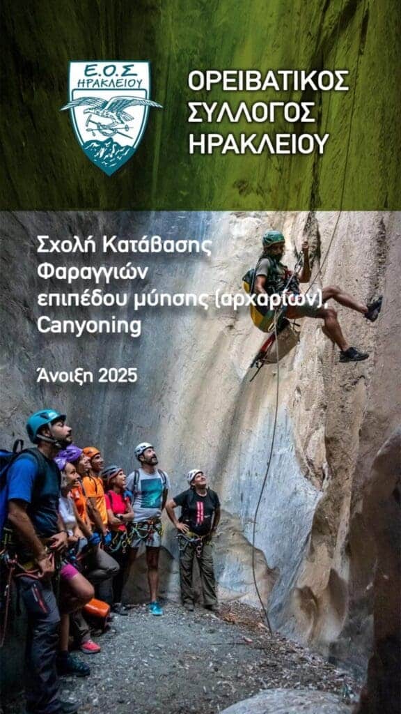 Ο Ορειβατικός Σύλλογος Ηρακλείου διοργανώνει Σχολή Κατάβασης Φαραγγιών – canyoning, επιπέδου αρχαρίων (μύησης) την Άνοιξη 2025.