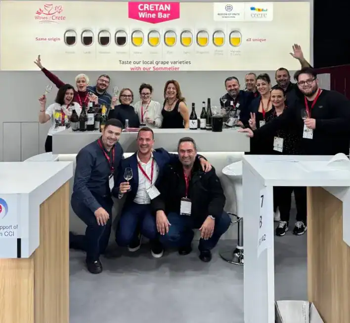 Στο περίπτερο της Κρήτης συμμετείχαν 8 κρητικά οινοποιεία: οινοποιείο Σίλβα – Δασκαλάκη, Οινοποιείο Διαμαντάκη, Οινοποιείο Δουλουφάκη, Οινοποιείο Ζαχαριουδάκη, Ιδαία Οινοποιητική, Οινοποιείο Λουλούδη, Οινοποιείο Ντουράκη και Οινοποιείο Στραταριδάκη. Πλήθος επαγγελματιών επισκέφθηκαν το ενιαίο wine bar που υποστήριζε η οινοχόος Υρώ Κολιακουδάκη Dip WSET, όπου οι επισκέπτες είχαν τη δυνατότητα να δοκιμάσουν ετικέτες από 36 οινοποιεία του νησιού και να πληροφορηθούν για τον Κρητικό αμπελώνα. Το ιδιαίτερο γραφικό που δημιουργήθηκε για να πλαισιώσει την παρουσία των οινοποιών, έδινε χρήσιμες πληροφορίες για τις τοπικές ποικιλίες, τις οινοπαραγωγικές ζώνες ΠΟΠ και ΠΓΕ, αλλά και για την μορφολογία του νησιού.