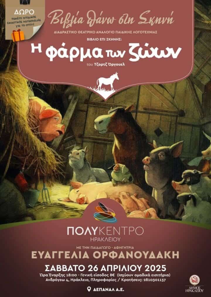 Διαδραστικό Θεατρικό Αναλόγιο παιδικής λογοτεχνίας με την Ευαγγελία Ορφανουδάκη. Μία διαδραστική παράσταση φιλαναγνωσίας, που συστήνει σπουδαία κείμενα στα παιδιά με επιτόπια δραματοποίηση και παιχνίδια ρόλων από μικρούς και μεγάλους. Περισσότερα στον σύνδεσμο: https://www.heraklionculture.gr/events_all/heraklion-art-cafe-books-on-the-stage-2025-8-2/