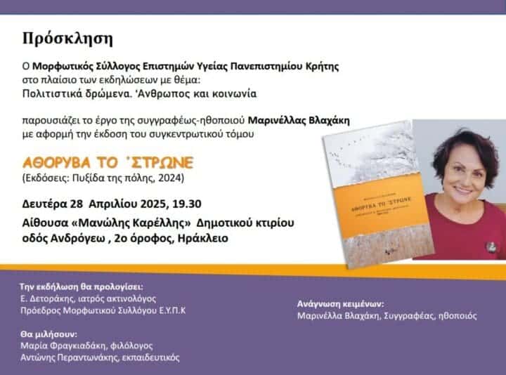 Περισσότερα στον σύνδεσμο: https://www.heraklionculture.gr/events_all/parousiasi-vivliou-vlachaki/