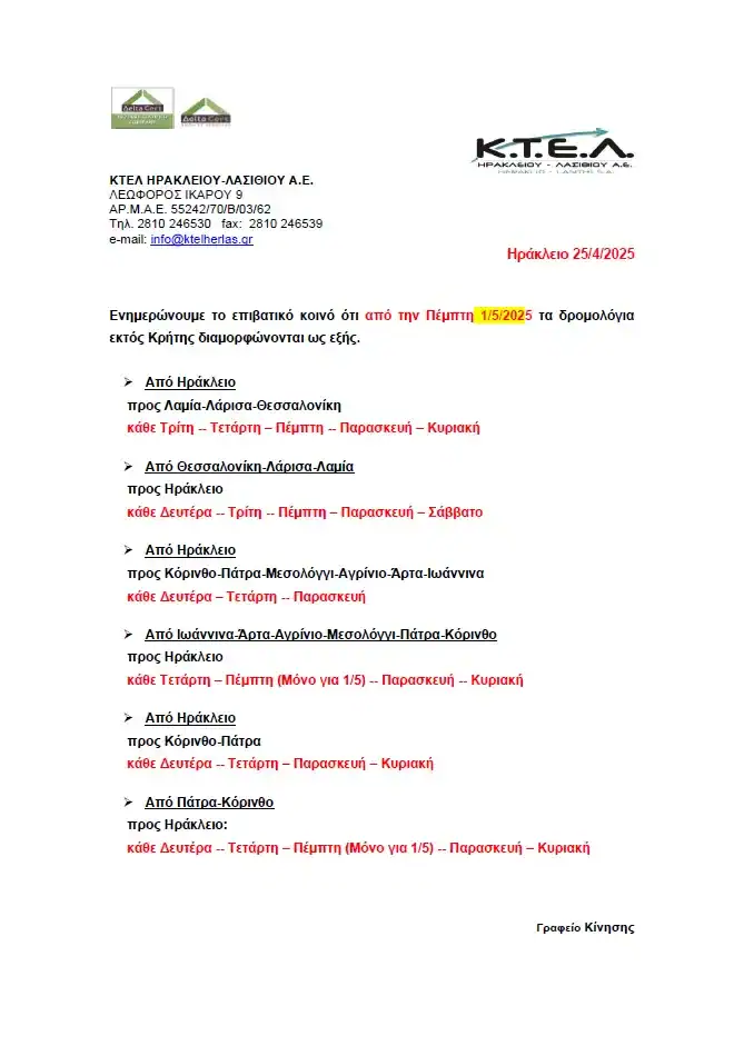 Η ΚΤΕΛ Ηρακλείου -Λασιθίου, ενημερώνει το επιβατικό κοινό ότι από την Πέμπτη 1/5/2025 τα δρομολόγια εκτός Κρήτης διαμορφώνονται ως εξής: