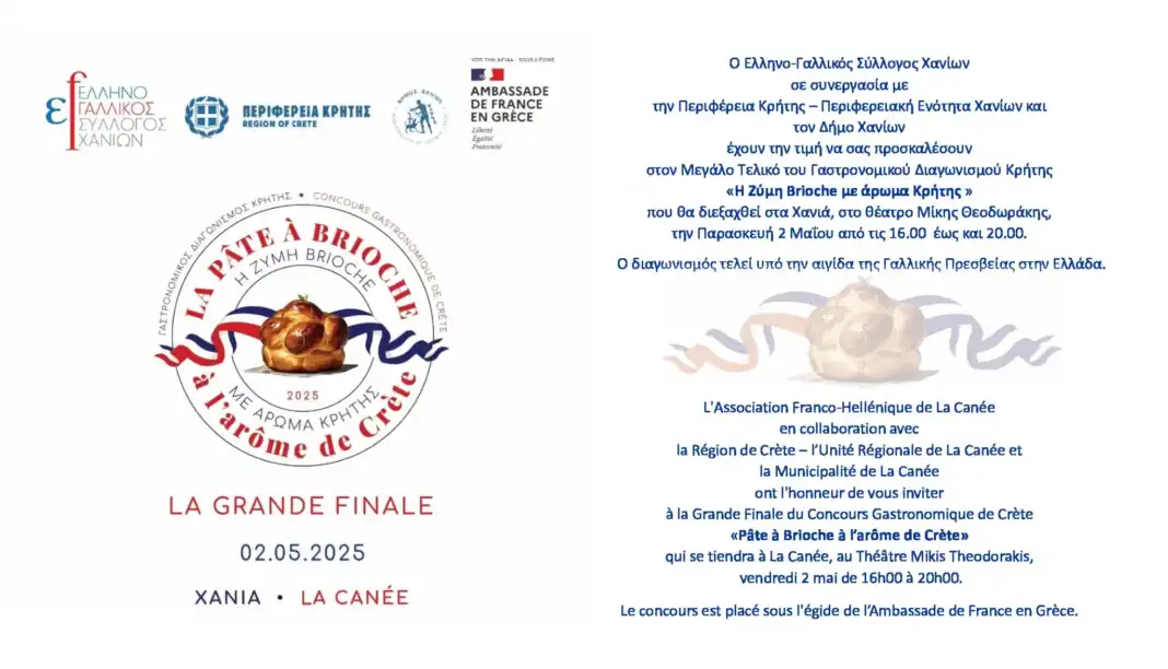 Ύστερα από τον επιτυχημένο πρώτο γύρο  του Γαστρονομικού Διαγωνισμού  «Pâte à Brioche  με άρωμα Κρήτης», έρχεται ο Μεγάλος Τελικός που θα διεξαχθεί στις 2 Μαΐου 2025 στο Θέατρο Μίκης Θεοδωράκης με ώρα εκκίνησης στις 16:00 το απόγευμα.