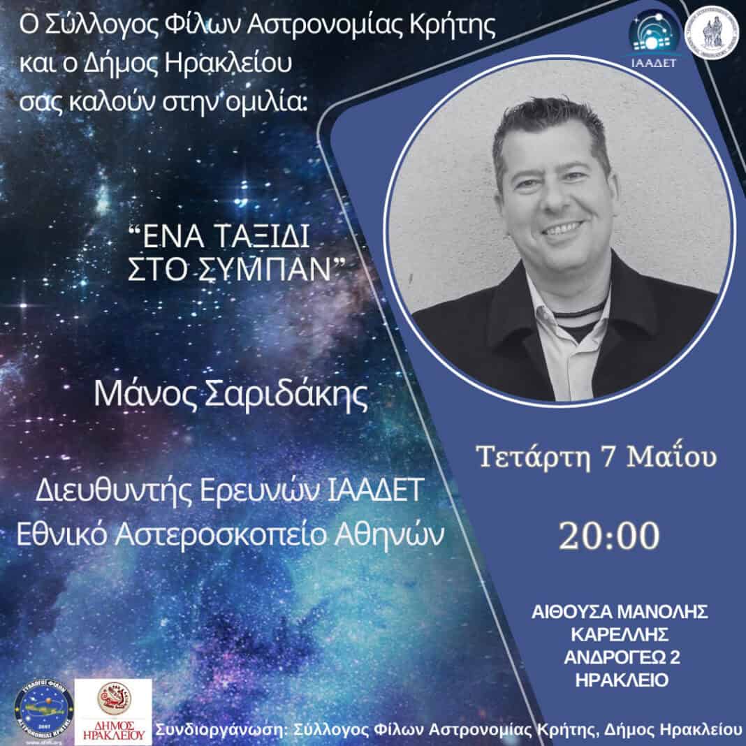 O Δήμος Ηρακλείου και ο Σύλλογος Φίλων Αστρονομίας Κρήτης διοργανώνουν ομιλία με θέμα «Ένα Ταξίδι στο Σύμπαν», σήμερα Τετάρτη 7 Μαΐου 2025 στις 20:00 μ.μ, στην αίθουσα «Μ. Καρέλλης» της οδού Ανδρόγεω 2.