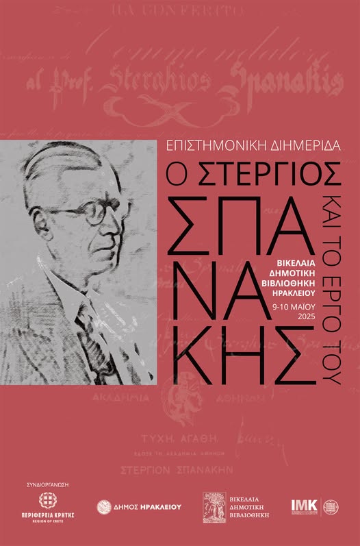 Επιστημονική διημερίδα με τίτλο «Ο Στέργιος Σπανάκης και το έργο του» θα πραγματοποιηθεί την Παρασκευή 9 και το Σάββατο 10 Μαΐου 2025 στην Αίθουσα «Θεοτοκόπουλος» (2ος όροφος) της Βικελαίας Δημοτικής Βιβλιοθήκης. Η εκδήλωση αποτελεί συνδιοργάνωση της Περιφέρειας Κρήτης, του Δήμου Ηρακλείου / Βικελαίας Δημοτικής Βιβλιοθήκης και της Εταιρίας Κρητικών Ιστορικών Μελετών.