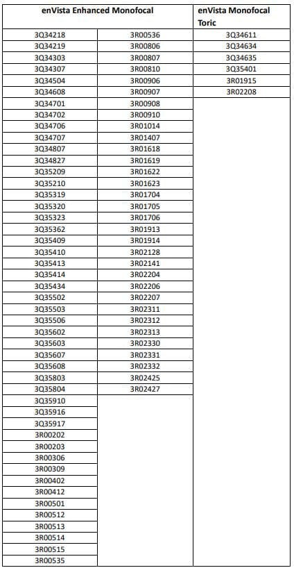 Αποφασίζουμε την ανάκληση των παρτίδων του συνημμένου πίνακα, Ιατροτεχνολογικών προϊόντων, κατηγορίας MDD Class IIb, enVista Enhanced Monofocal MX60E και enVista Monofocal Toric MX60ET (μονοεστιακούς ενδοφθάλμιους φακούς λόγω αυξημένου αριθμού αναφορών συνδρόμου τοξικού πρόσθιου τμήματος, κατά την χρήση του προϊόντος.