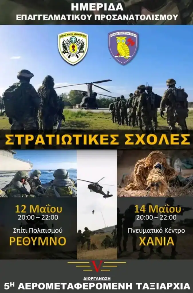 Η 5η Αερομεταφερόμενη Ταξιαρχία, σε συνδιοργάνωση με την Περιφέρεια Κρήτης – Περιφερειακή Ενότητα Χανίων διοργανώνει Ημερίδα Επαγγελματικού Προσανατολισμού, την Τετάρτη 14 Μαΐου 2025, ώρα 20.00 – 22.00, στην αίθουσα «Πολυχρόνης Πολυχρονίδης» του Πνευματικού Κέντρου Χανίων.