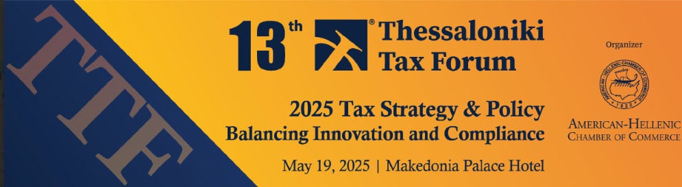 Το Ελληνο-Αμερικανικό Εμπορικό Επιμελητήριο, με τη συνεργασία της Επιτροπής Φορολογικών Θεμάτων, ανακοινώνει τη διοργάνωση του 13ου Thessaloniki Tax Forum (TTF) με τίτλο «2025 Tax Strategy & Policy: Balancing Innovation and Compliance», το οποίο θα πραγματοποιηθεί τη Δευτέρα 19 Μαΐου 2025, στο ξενοδοχείο Makedonia Palace στη Θεσσαλονίκη.
