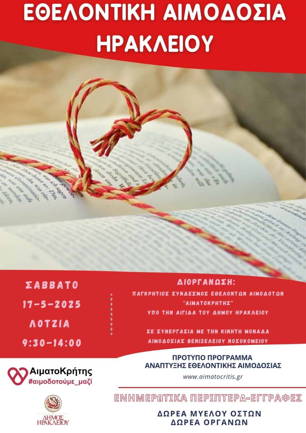 Το Σάββατο 17 Mαίου 2025 θα πραγματοποιηθεί εθελοντική αιμοδοσία στο κέντρο της πόλης του Ηρακλείου και συγκεκριμένα στο αίθριο της Λότζια από τις 09:30 έως τις 14:00.