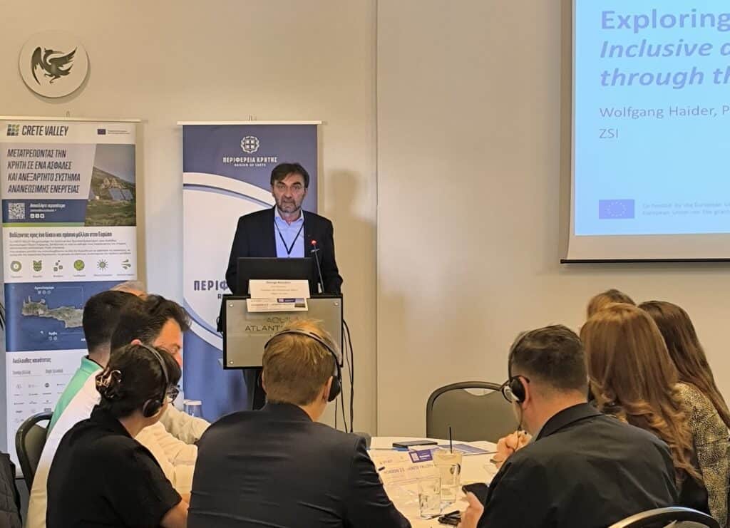 Στη συνέχεια, ο κ. Wolfgang Haider, Διαχειριστής Έργου και Ερευνητής του Center for Social Innovation (ZSI), παρουσίασε τις αρχές της κοινωνικής διάστασης της ενεργειακής μετάβασης, όπως αυτή ενσωματώνεται στο πλαίσιο του Crete Valley. Τονίστηκε η σημασία της ποικιλομορφίας (diversity) σε επίπεδο χρηστών, φορέων διακυβέρνησης και κινήτρων για την επιτυχή υλοποίηση των ενεργειακών κοινοτήτων στην Κρήτη.