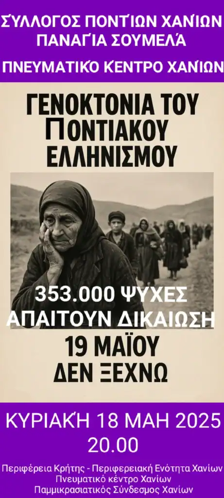Ο Σύλλογος Ποντίων Χανίων «Παναγία Σουμελά», η Περιφέρεια Κρήτης – Περιφερειακή Ενότητα Χανίων και ο Παμμικρασιατικός Σύνδεσμος Χανίων, συνδιοργανώνουν εκδήλωση Τιμής και Μνήμης για τη Γενοκτονία του Ποντιακού Ελληνισμού, στο πλαίσιο της ανακήρυξης από τη Βουλή των Ελλήνων της 19ης Μαΐου, ως «Ημέρα Μνήμης για τη Γενοκτονία των Ελλήνων στο Μικρασιατικό Πόντο».