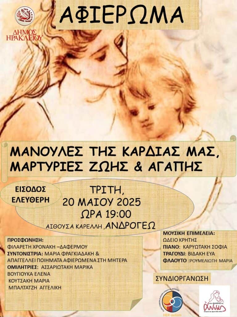 Εκδήλωση αφιέρωμα στη Γιορτή της Μητέρας με τίτλο «Μανούλες της καρδιάς μας – Μαρτυρίες ζωής και αγάπης» διοργανώνει η Αντιδημαρχία Εθελοντισμού του Δήμου Ηρακλείου σε συνεργασία με τον Σύλλογο Γονέων και Φίλων ΑΜΕΑ «Στην Αγκαλιά της Άννας» και την ομάδα HER-autism την Τρίτη 20 Μαΐου 2025 στις 19:00, στην αίθουσα «Μανόλης Καρέλλης» στο δημοτικό κτίριο της οδού Ανδρόγεω.